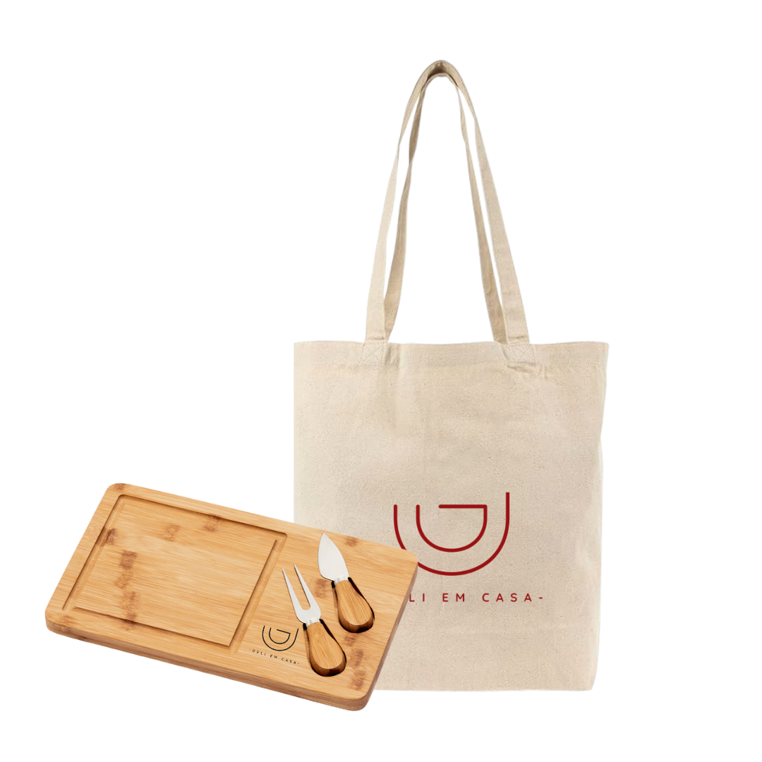 Seu design clean e atemporal, aliado à personalização aplicada com alta definição, transforma a sacola em um item versátil e de alto valor percebido. Na imagem, ela acompanha um kit gourmet em bambu, demonstrando perfeitamente como a sacola funciona como embalagem premium, elevando a entrega e destacando a identidade da marca.